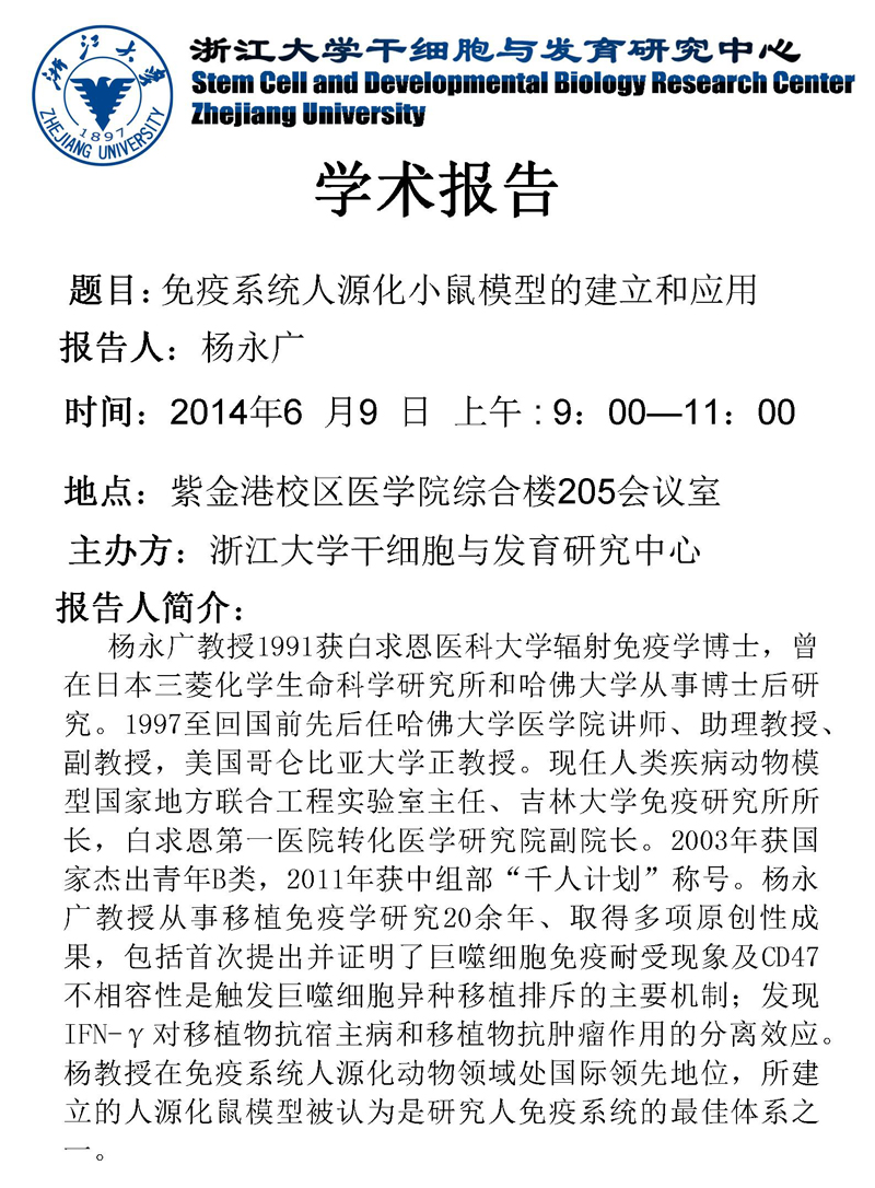 吉林大学杨永广教授学术报告——免疫系统人源化小鼠模型的建立和应用